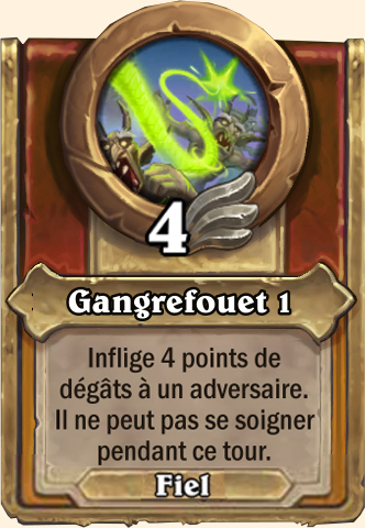 Gangrefouet Inflige 6 points de dégâts à un adversaire. Il ne peut pas se soigner pendant ce tour Inflige 8 points de dégâts à un adversaire. Il ne peut pas se soigner pendant ce tour Inflige 9 points de dégâts à un adversaire. Il ne peut pas se soigner pendant ce tour Inflige 10 points de dégâts à un adversaire. Il ne peut pas se soigner pendant ce tour |