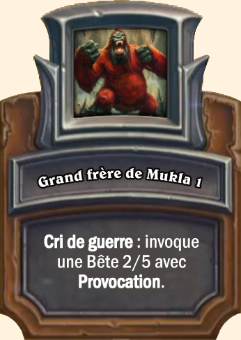 Grand frère de Mukla Cri de guerre : invoque une Bête 5/10 avec Provocation Cri de guerre : invoque une Bête 8/15 avec Provocation Cri de guerre : invoque une Bête 12/24 avec Provocation |