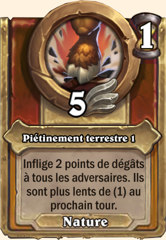 Piétinement terrestre Inflige 5 points de dégâts à tous les adversaires. Ils sont plus lents de (2) au prochain tour Inflige 8 points de dégâts à tous les adversaires. Ils sont plus lents de (3) au prochain tour Inflige 9 points de dégâts à tous les adversaires. Ils sont plus lents de (3) au prochain tour Inflige 10 points de dégâts à tous les adversaires. Ils sont plus lents de (3) au prochain tour |