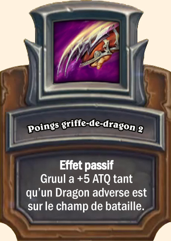 Poings griffe-de-dragon Effet passif. Gruul a +10 ATQ tant qu’un Dragon adverse est sur le champ de bataille Effet passif. Gruul a +15 ATQ tant qu’un Dragon adverse est sur le champ de bataille |