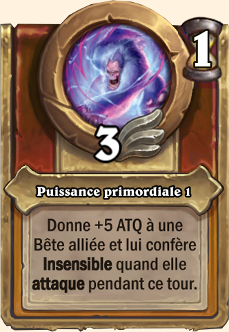 Puissance primordiale Donne +8 ATQ à une Bête alliée et lui confère Insensible quand elle attaque pendant ce tour Donne +11 ATQ à une Bête alliée et lui confère Insensible quand elle attaque pendant ce tour Donne +13 ATQ à une Bête alliée et lui confère Insensible quand elle attaque pendant ce tour Donne +15 ATQ à une Bête alliée et lui confère Insensible quand elle attaque pendant ce tour |
