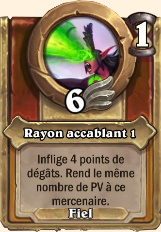 Rayon accablant Inflige 7 points de dégâts. Rend le même nombre de PV à ce mercenaire Inflige 10 points de dégâts. Rend le même nombre de PV à ce mercenaire Inflige 11 points de dégâts. Rend le même nombre de PV à ce mercenaire Inflige 12 points de dégâts. Rend le même nombre de PV à ce mercenaire |
