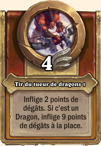 Tir du tueur de dragons Inflige 5 points de dégâts. Si c’est un Dragon, inflige 15 points de dégâts à la place Inflige 8 points de dégâts. Si c’est un Dragon, inflige 21 points de dégâts à la place Inflige 9 points de dégâts. Si c’est un Dragon, inflige 23 points de dégâts à la place Inflige 10 points de dégâts. Si c’est un Dragon, inflige 25 points de dégâts à la place |