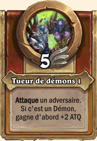 Tueur de démons Attaque un adversaire. Si c'est un Démon, gagne d'abord +4 ATQ Attaque un adversaire. Si c'est un Démon, gagne d'abord +6 ATQ Attaque un adversaire. Si c'est un Démon, gagne d'abord +6 ATQ Attaque un adversaire. Si c'est un Démon, gagne d'abord +6 ATQ |