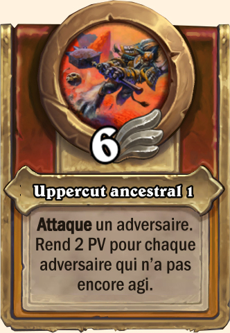 Uppercut ancestral Attaque un adversaire. Rend 4 PV pour chaque adversaire qui n’a pas encore agi Attaque un adversaire. Rend 6 PV pour chaque adversaire qui n’a pas encore agi Attaque un adversaire. Rend 7 PV pour chaque adversaire qui n’a pas encore agi Attaque un adversaire. Rend 8 PV pour chaque adversaire qui n’a pas encore agi |