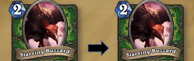 Le Chasseur a de son côté, droit à deux nerfs. Le premier concerne le Busard affamé qui voit ses points de vie réduits à 1. Le second sera appliqué au sort Lâcher les chiens. Les développeurs ne savent pas encore quelles modifications ils lui apporteront, mais ils s'accordent à dire que cette carte est trop puissante, puisqu'elle permet de gagner la partie en un seul tour.