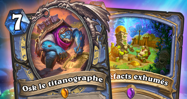 Nous commençons par la carte légendaireOsk le titanographe qui permet de gagner une capacité de Titan aléatoire qui change à chaque tour dans votre main. Nous continuons avec le sort Bataille du rangement qui inflige 3 points de dégâts à un serviteur, et qui coûte (0) cristal si vous l'avez découvert pendant ce tour.
