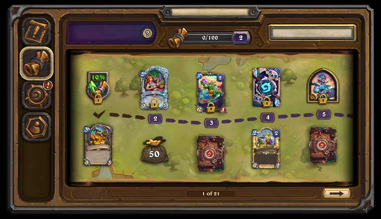 Le parcours de récompenses gratuit de Paradis en péril contiendra des paquets de cartes de Paradis en péril, une carte épique aléatoire, deux cartes légendaires aléatoires, des admissions pour la taverne, un nouveau dos de carte et des tonnes d’or ! Vous pourrez également obtenir 14 cartes dorées et la carte légendaire Gorgonzormu, issue de l’extension !* Une fois votre parcours terminé, vous pourrez choisir un modèle de héros ou d’héroïne parmi les 21 disponibles.