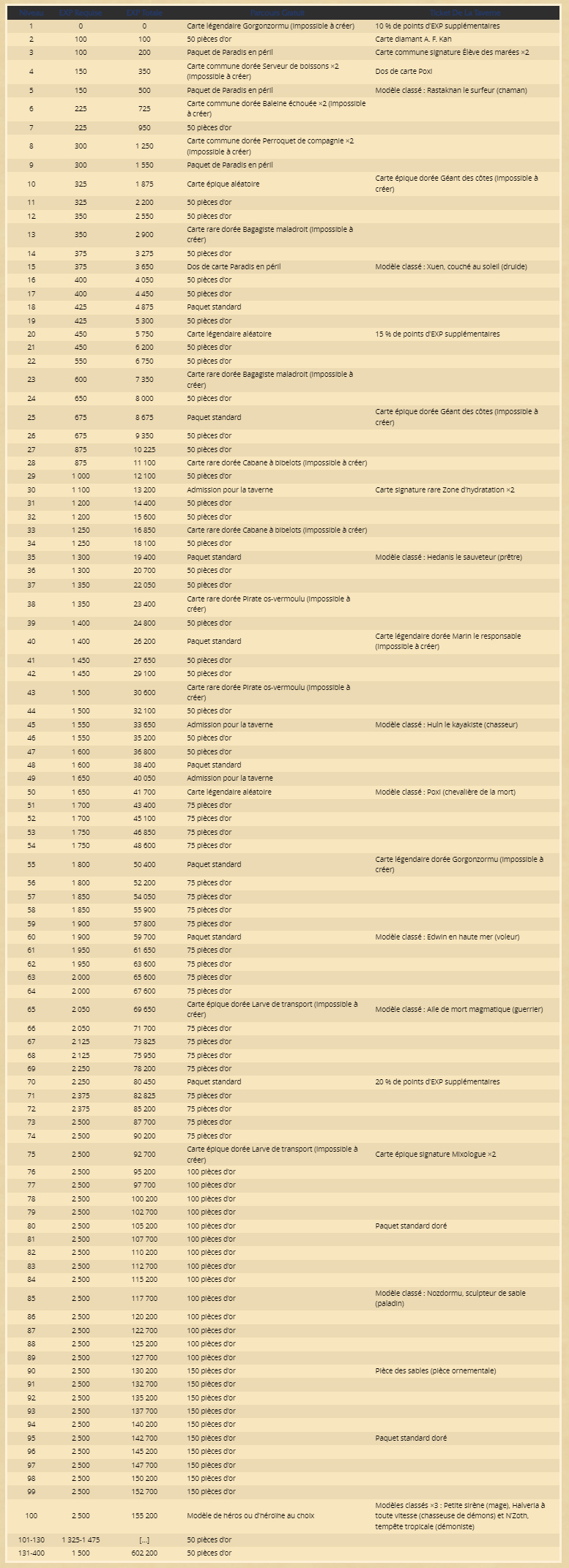 Achetez le ticket de la taverne à tout moment afin de recevoir immédiatement un bonus d’expérience de 10 % qui durera jusqu’à la fin de l’extension ainsi que tous les objets du parcours de récompenses payant jusqu’à votre niveau actuel. Au fil de votre progression au sein du ticket de la taverne de Paradis en péril, vous pourrez gagner des bonus d’expérience supplémentaires, la carte légendaire diamant A. F. Kah, les cartes légendaires dorées Marin le responsable et Gorgonzormu, 2 exemplaires dorés de la carte épique Géant des côtes, 2 exemplaires signature de la carte épique Mixologue, 2 exemplaires signature de la carte rare Zone d’hydratation, 2 exemplaires signature de la carte commune Élève des marées, une nouvelle pièce ornementale, un nouveau dos de carte, un modèle estival héroïque pour chaque classe et 2 paquets standard dorés !*