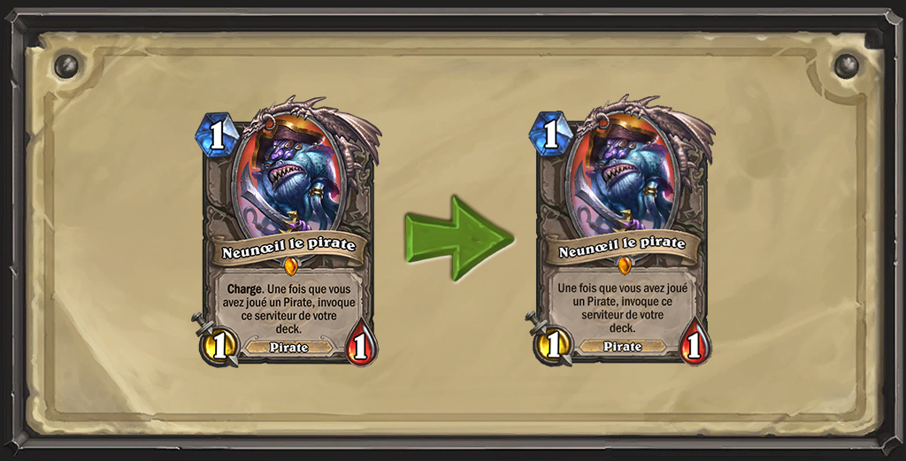 À l’approche de la nouvelle année de Hearthstone, il nous semblait problématique de laisser Neunœil quitter le format Standard dans son état actuel. Cette carte est si puissante que presque toutes les classes ont intégré des pirates à leurs decks pour en profiter, et son impact en début de partie oblige les decks Contrôle à prévoir des ripostes spécialisées. Ce changement devrait laisser davantage de flexibilité aux joueurs du format Libre en matière de construction de decks.