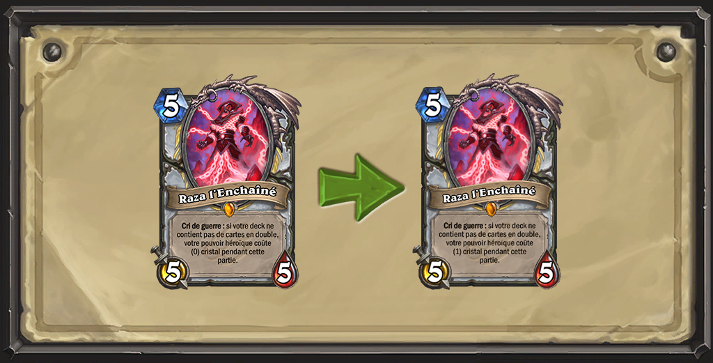 Comme pour Neunœil le pirate, nous nous sommes interrogés sur l’avenir de Raza. Cette carte est utilisée en combo avec Anduin le faucheur noir, et certaines parties dépendent lourdement de son apparition au cinquième tour ou avant. En ajustant son Cri de guerre, nous réduisons son potentiel de combo avec Anduin le faucheur noir au format Standard, tout en conservant une puissance raisonnable au format Libre en vue de la nouvelle année de Hearthstone.