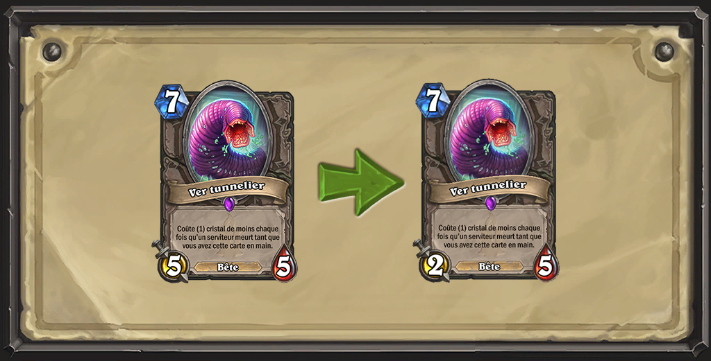 Ver tunnelier étant une carte neutre très puissante, de nombreuses classes l’ont donc adoptée. En réduisant son attaque, nous amoindrissons son impact et sa puissance, mais les joueurs qui la piocheront assez tôt bénéficieront tout de même d’un serviteur à faible coût à un moment idéal de la partie.