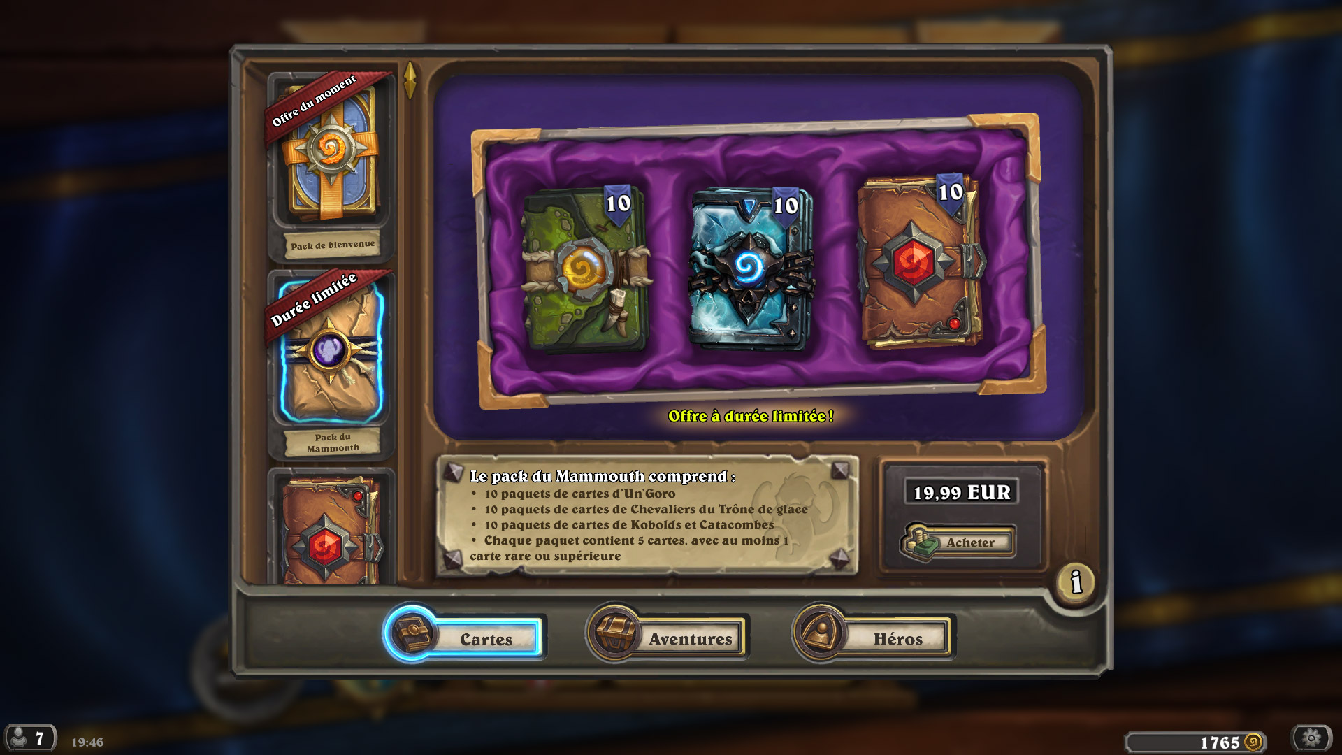 Le pack du Mammouth, disponible dans la boutique en jeu à 19,99 € pour une durée limitée, contient 10 paquets Un'Goro, 10 paquets Trône de glace, ainsi que 10 paquets Kobolds et Catacombes. À la manière du pack de bienvenue, vous ne pouvez acheter qu'un pack du Mammouth par compte.