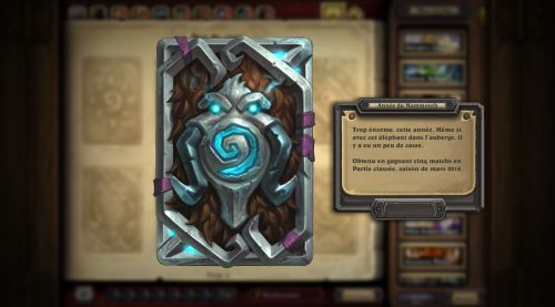 2 dos de cartes rejoignent ainsi Hearthstone. Si vous avez pu découvrir Étincelles pour le mois de février 2018, vous pouvez aussi remarquer l'ajout de Année du Mammouth qui peut être obtenu au mois de mars 2018 en gagnant 5 parties classées grâce aux changements à venir pour le mode de jeu.