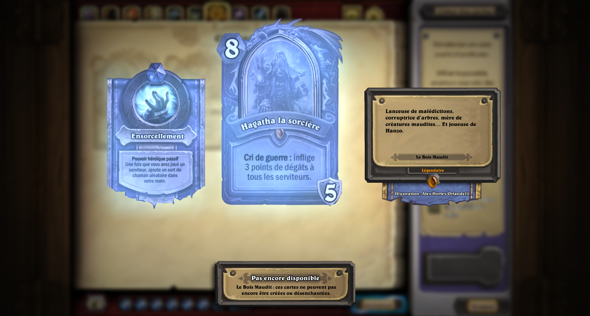 Les 135 cartes Bois Maudit sont visibles en jeu dans la collection avec leurs textes d'ambiance. Afin de les afficher, il faut activer le filtre Bois Maudit en mode Création (inclure les cartes impossibles à créer).