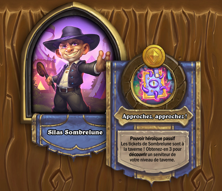 Des serviteurs aléatoires de la taverne de Bob posséderont des tickets de Sombrelune. Achetez-en trois pour découvrir un serviteur correspondant à votre niveau de taverne.