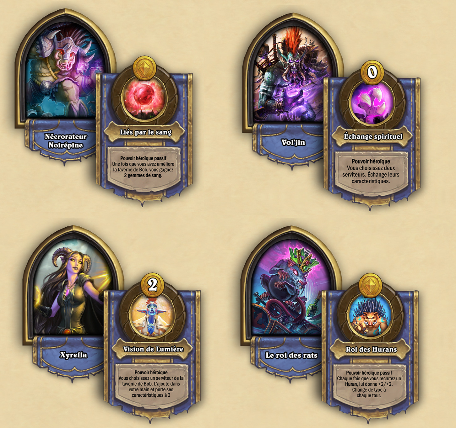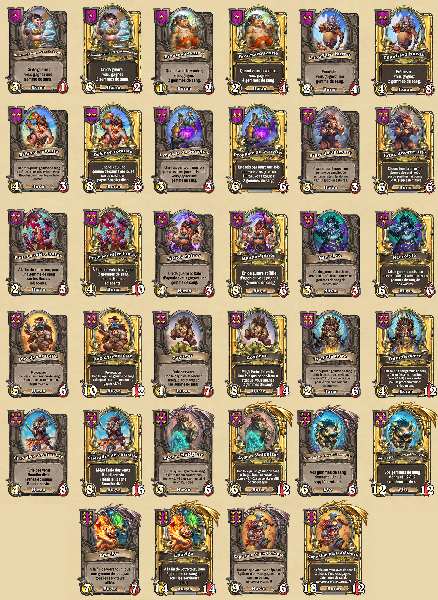 La mise à jour des Hurans ajoute 17 serviteurs inédits, 3 héros et une nouvelle mécanique : les gemmes de sang ! Les gemmes de sang sont des sorts qui donnent +1/+1 à un serviteur allié. Certains Hurans vous octroient des gemmes de sang, tandis que d’autres déclenchent des interactions spéciales quand des gemmes sont jouées.