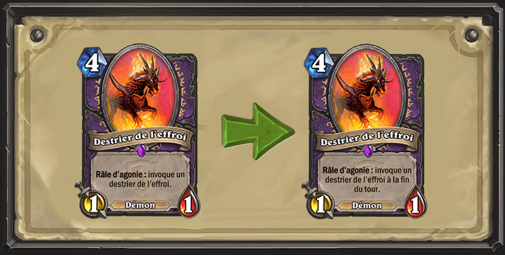 Des changements sont à noter pour certaines cartes de Hearthstone. Comme prévu par les développeur depuis quelques temps, ces modifications concernent essentiellement le Destrier de l'effroi.
