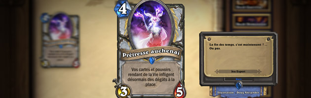 Dans Hearthstone: Heroes of Warcraft, tous les héros, les noms de cartes, les armes et les sorts proviennent de l’univers de Warcraft. Normalement, nous utilisons des termes glossarisés pour tout ce qui est lié à l’univers de World of Warcraft, mais pour Hearthstone, nous savions que la place pour le texte serait limitée dans l’interface, puisque le jeu devait également sortir sur iPad. Nous connaissions la limite de caractères à l’avance et nous avons donc dû prendre la décision de modifier légèrement certains des noms de carte les plus longs. Ce qui explique pourquoi il peut y avoir quelques différences avec WoW, comme par exemple pour la carte « Prêtresse auchenai » (Auchenai Soulpriest) qui aurait dû normalement être « Prêtresse de l’âme auchenai » en français.