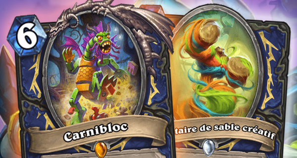 Nous débutons avec une carte légendaire Carnibloc avec une Miniaturisation et un Cri de guerre qui permet de déclencher 3 fois votre prochain Cri de guerre, mais il ne peut pas infliger de dégâts au héros ou héroïne adverse.
