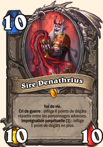 Sire Denathrius est une 10/10 pour 10 cristaux de mana. Nous retrouvons sur cette carte la mécanique Vol de vie, un Cri de guerre qui permet d'infliger 5 points de dégâts répartis entre les personnages adverses et une Imprégnation perpétuelle 1 qui inflige 1 point de dégâts supplémentaire.
