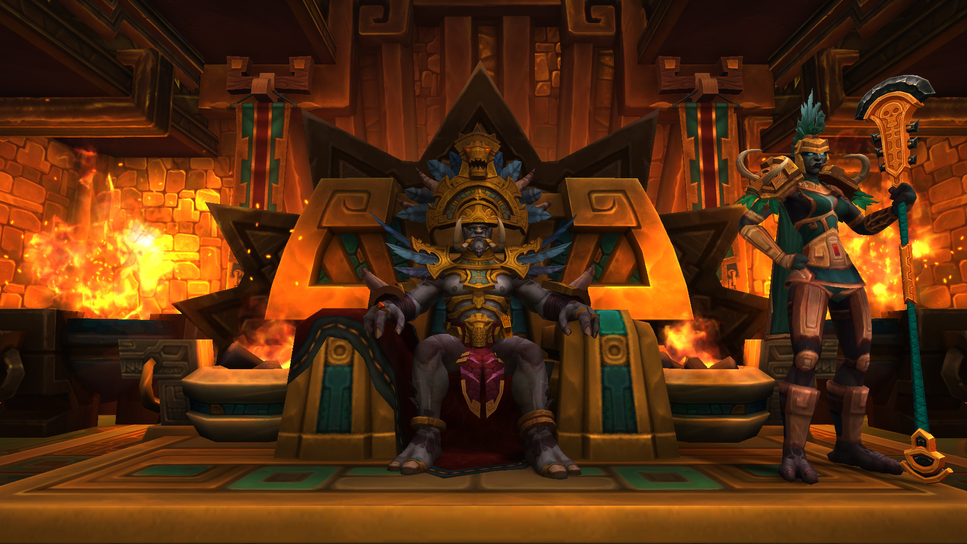Le roi Rastakhan sur son trône doré dans World of Warcraft