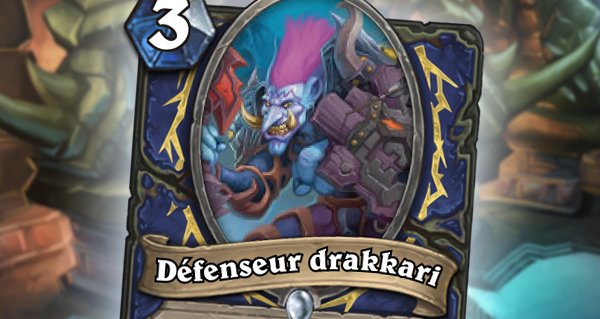 Défenseur drakkari est une 2/8 pour 3cristaux de mana. Côté effet, la carte dispose de Provocation, avec comme contre-partie une Surcharge de 3 cristaux.