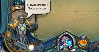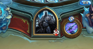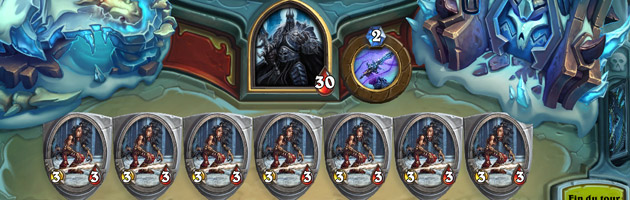 Le deck mis à votre disposition ne joue pas en votre, et il est constitué de cartes coûtant très cher en mana. Cependant, vous êtes averti par Tirion que les renforts arriveront au 3ème tour. Le roi-liche dispose de ses cartes Chevaliers de la mort, et il utilise dès le premier tour le sort Drain de sang qui a pour particularité que le prochain sort lancé pendant ce tour coût 0 cristal de mana. Il l'enchaine avec la carte Armée des morts qui permet d'invoquer 7 goules 3/3 avec Provocation.