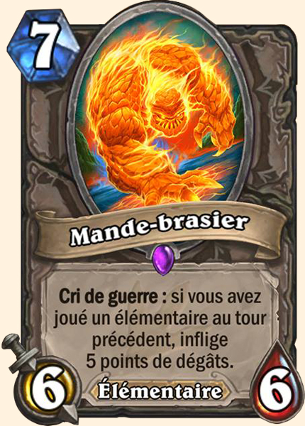 On retrouve ainsi le Serviteur de Kalimos est un élémentaire 4/5 pour 5 qui découvre un élémentaire si vous en avez joué au tour précédent. Le Mande-brasier est quant à lui un élémetaire 6/6 pour 7 qui inflige 5 points de dégâts si vous avez joué un élémentaire au tour précédent.