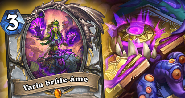 La carte légendaire Varia brûle-âme permet la mécanique suivante : quand un Mort-vivant allié meurt, inflige 2 points de dégât au héros ou à l’héroïne adverse et vous obtenez un sort d’ombre de classe prêtre aléatoire.