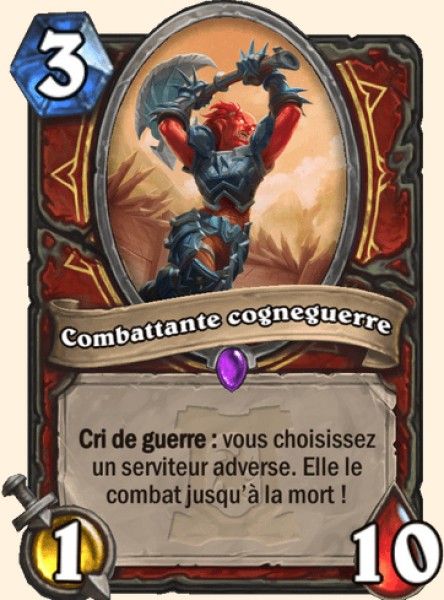| Description | Cri de guerre : vous choisissez un serviteur adverse. Elle le combat jusqu’à la mort ! |
