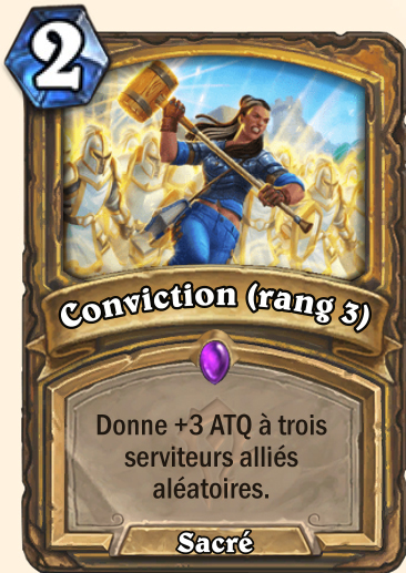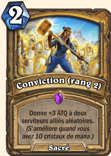 | Description | Donne +3 ATQ à un serviteur allié aléatoire. (S’améliore quand vous avez 5 cristaux de mana.) |