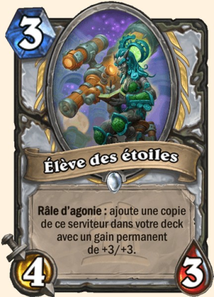 | Description | Râle d’agonie : ajoute une copie de ce serviteur dans votre deck avec un gain permanent de +3/+3. |