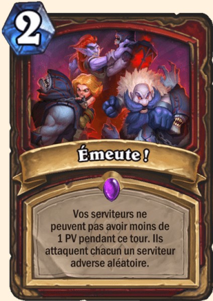 | Description | Vos serviteurs ne peuvent pas avoir moins de 1 PV pendant ce tour. Ils attaquent chacun un serviteur adverse aléatoire. |