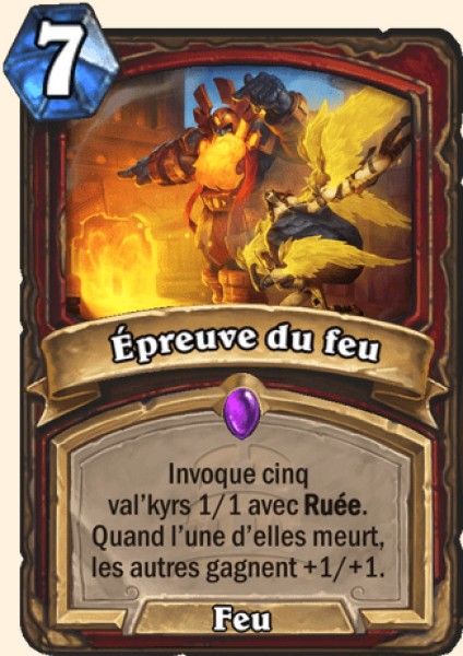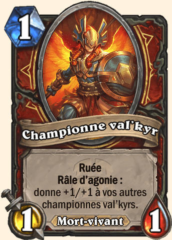 | Description | Invoque cinq val’kyrs 1/1 avec Ruée. Quand l’une d’elles meurt, les autres gagnent +1/+1. |