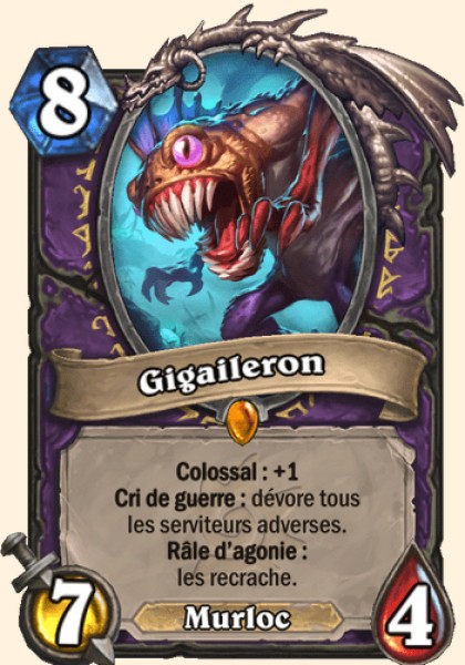 | Description | Colossal +1. Cri de guerre : dévore tous les serviteurs adverses. Râle d'agonie : les recrache. |