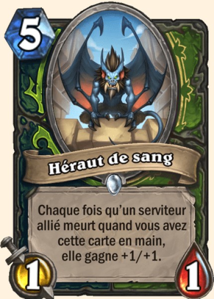 | Description | Chaque fois qu’un serviteur allié meurt quand vous avez cette carte en main, elle gagne +1/+1. |