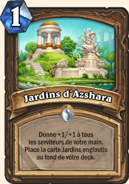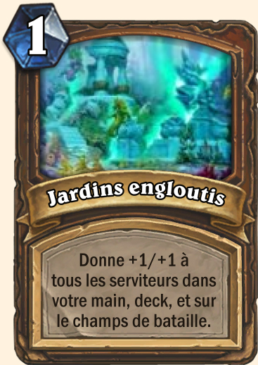 | Description | Donne +1/+1 à tous les serviteurs de votre main. Place la carte Jardins engloutis au fond de votre deck. |
