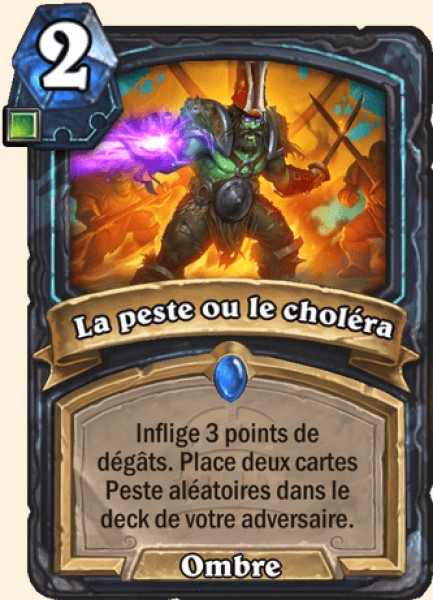 | Description | Inflige 3 points de dégâts à un serviteur. Place deux cartes Peste aléatoires dans le deck de votre adversaire. |