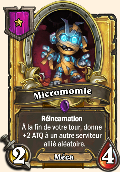 | Description | Réincarnation À la fin de votre tour, donne +1 ATQ à un autre serviteur allié aléatoire. |