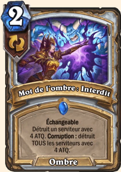 | Description | Échangeable Détruit un serviteur avec 4 ATQ. Corruption : détruit TOUS les serviteurs avec 4 ATQ. |