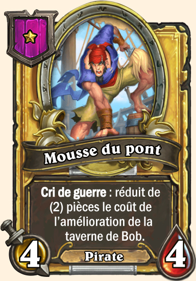 | Description | Cri de guerre : réduit de (1) pièce le coût de l’amélioration de la taverne de Bob. |