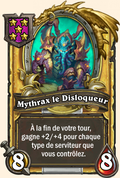 | Description | À la fin de votre tour, gagne +1/+2 pour chaque type de serviteur que vous contrôlez. |