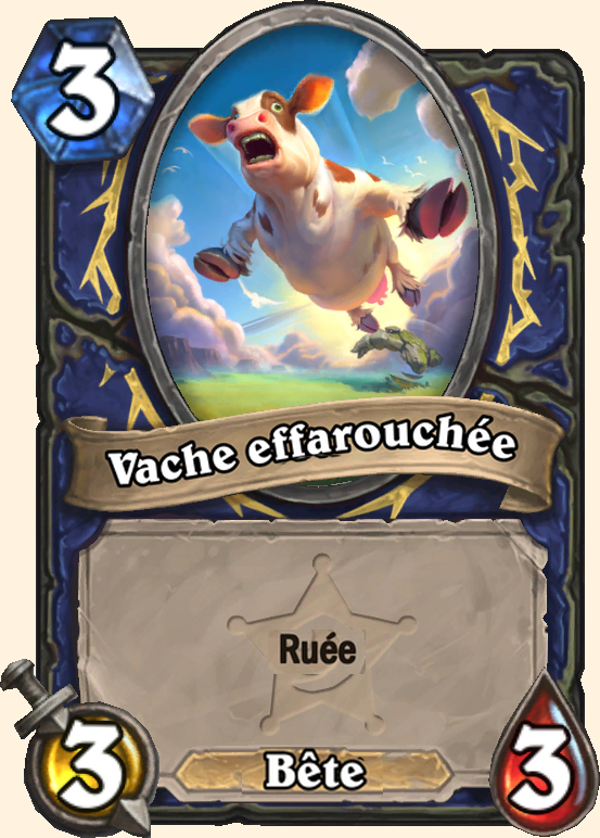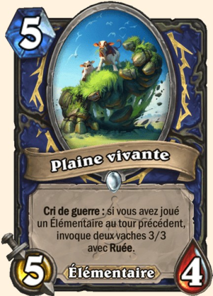 | Description | Cri de guerre : si vous avez joué un Élémentaire au tour précédent, invoque deux vaches 3/3 avec Ruée. |