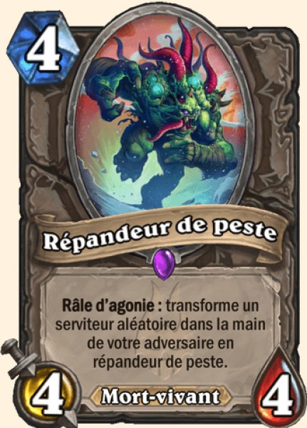 | Description | Râle d’agonie : transforme un serviteur aléatoire dans la main de votre adversaire en répandeur de peste. |
