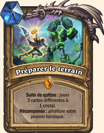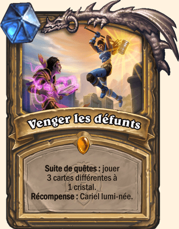 | Description | Suite de quêtes : jouer 3 cartes différentes à 1 cristal. Récompense : vous équipe de Justice de la Lumière 1/4. |