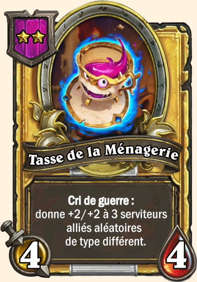 | Description | Cri de guerre : donne +1/+1 à 3 serviteurs alliés aléatoires de type différent. |
