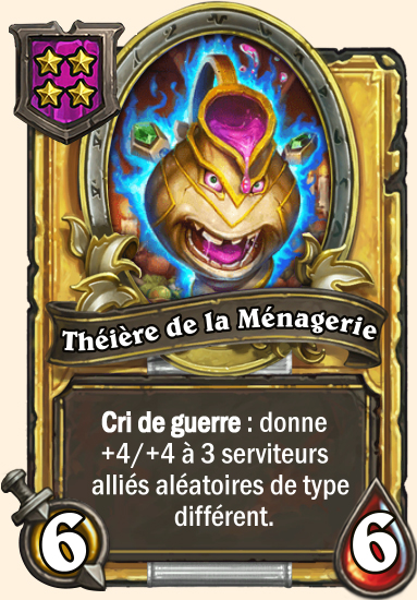 | Description | Cri de guerre : donne +2/+2 à 3 serviteurs alliés aléatoires de type différent. |