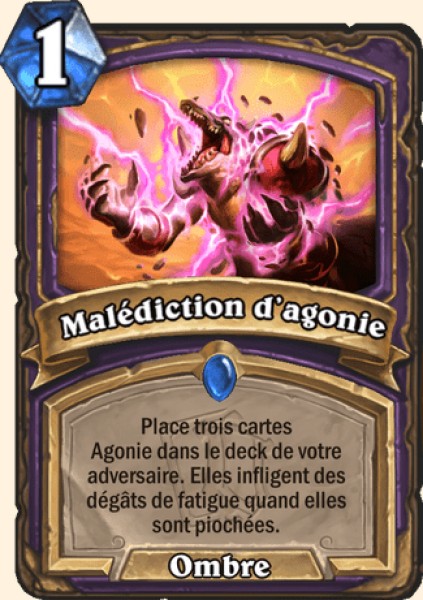 En gros, j'ai essayé de faire un deck un peu contrôle, avec du board, mais qui joue sur la longueur avec les malédictions. Le but premier n'est pas de lancer des combos pour mettre 18 malédictions et OTK (même si c'est possible), mais plutôt de la jouer en mode "je cale des malédictions pour pourrir la main, donc ses plays, et le deck de mon adversaire".