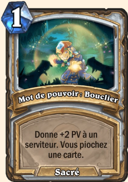 Ce sort est plus puissant en arène qu’en deck construits puisqu’il y aura plus de cibles potentiels. Quoiqu’il en soit, il aura un très faible impact sur le plateau. Tout comme le massacreur du temple, le mot de pouvoir : bouclier a une bonne synergie avec avec le pouvoir héroïque assez faible du prêtre. Il peut transformer un petit serviteur en une menace plus imposante. Ce sort est tout aussi bon en late lorsqu’il vous restera du mana non dépensé ou pour piocher. En bref, vous devrez toujours mulligan ce sort sauf si vous avez un serviteur qui peut survivre.